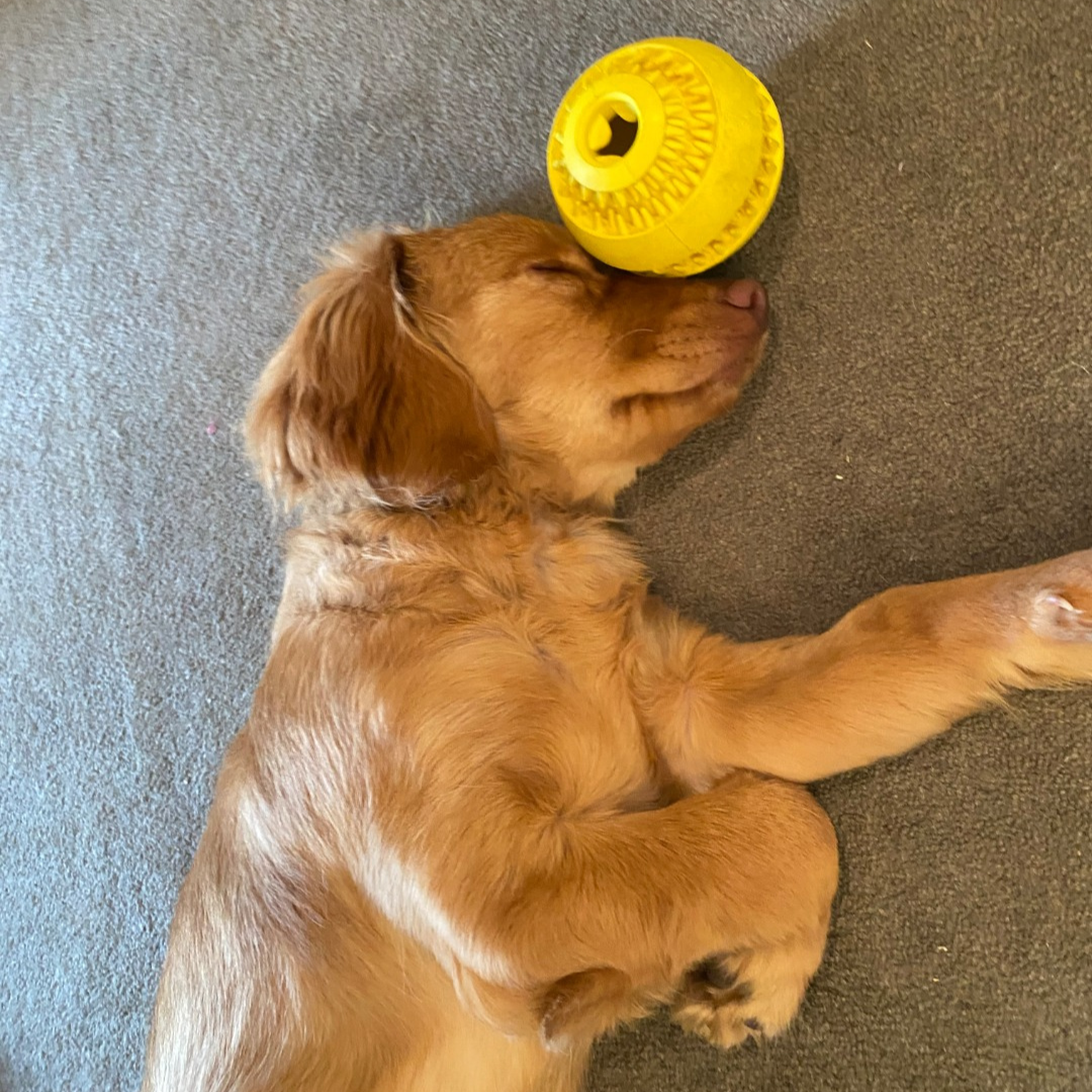 provides a stimulating & engaging activity for dogs requiring them to roll or chase & manipulate the ball in order to get the treats out